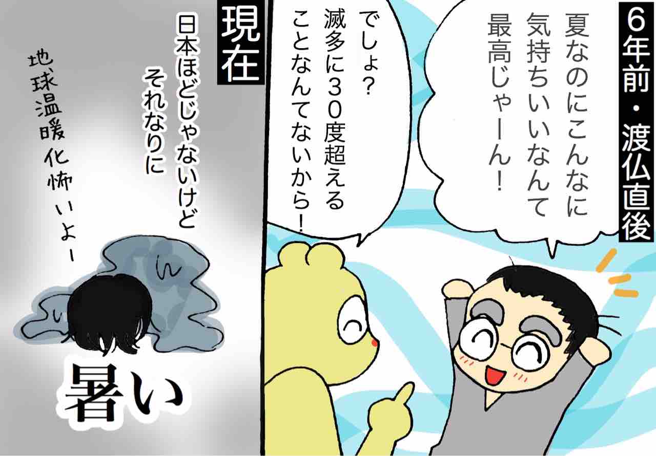 そうなんですよ!湿気がないから熱が体内にこもりやすいんですが、もともとはフランスの夏って長い冬に備えて外で思いっきり太陽を浴びる人が多かったので、そのせいもあってご年配の方が亡くなったのかなと思います…。