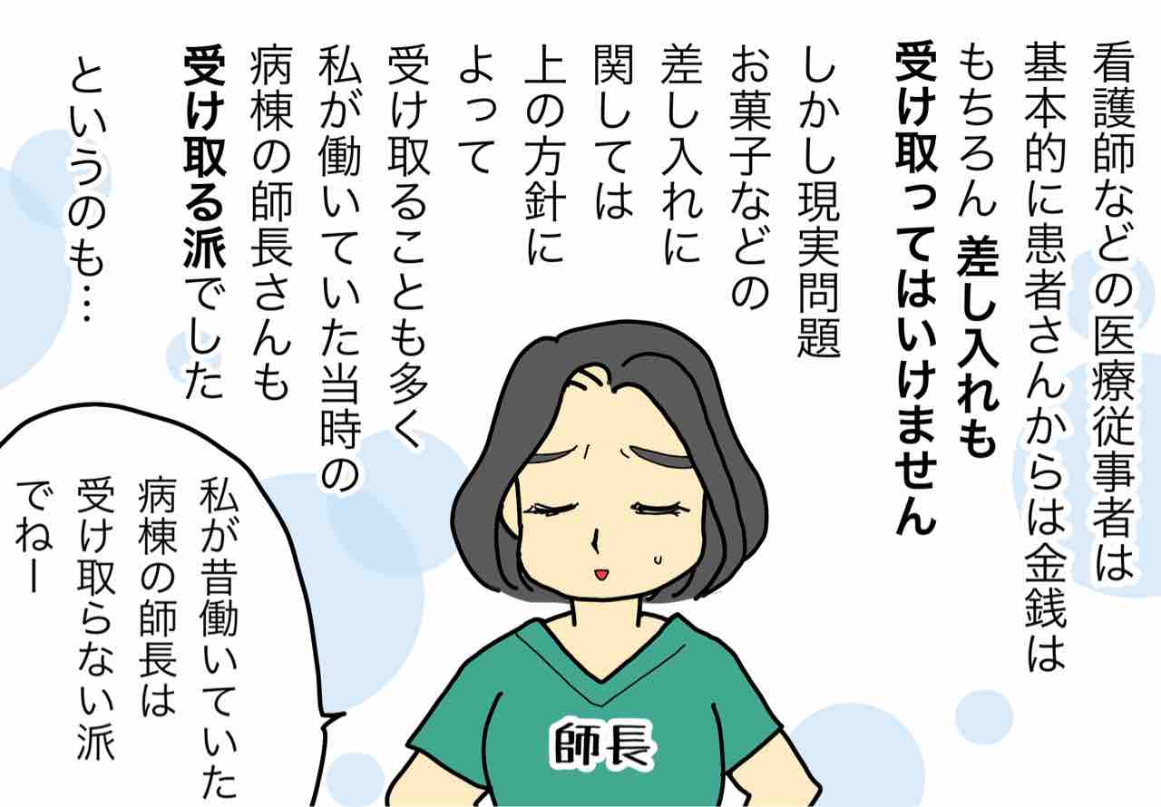 今働いてる病院では何度か断った上で渡してきたら有り難く受け取ってますが、後から苦情入れられないかヒヤヒヤして心からは喜べないですね