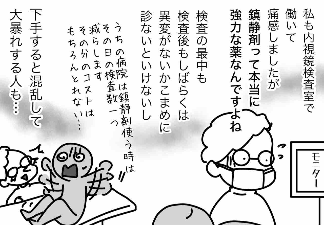 鎮静剤使うと検査する側の負担が大きいという点は知らなかったです。難しいですね💦